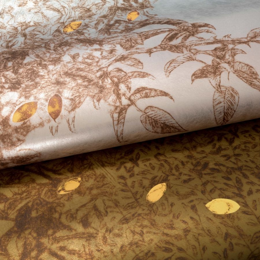 The large-scale four-panel mural of Trellis features vines of foliage and vibrantly colored leaves that seemingly climb up the wall, adding a romantic, enchanting ambiance to any room or setting. The subtle ombré background is printed over an Innovations classic metallic fabric faced vinyl, enhancing the botanical motif with a warm glow reminiscent of golden hour.